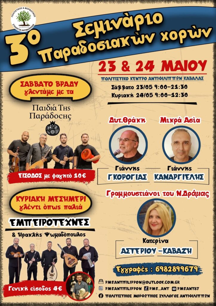 Ο Πολιτιστικός Σύλλογος Αντιφιλίππων διοργανώνει το 3ο Σεμινάριο Παραδοσιακών Χορών, το οποίο θα πραγματοποιηθεί το Σάββατο 23 και την Κυριακή 24 Μαΐου 2026 στο Πολιτιστικό Κέντρο Αντιφιλίππων Καβάλας.