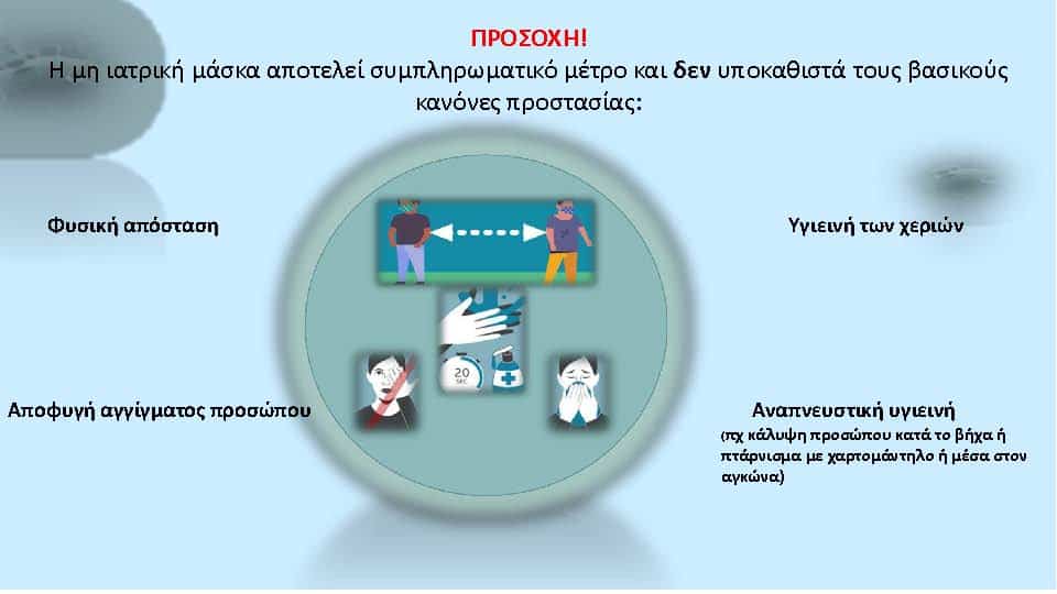 Σύμφωνα με τις οδηγίες δημόσιας υγείας (υγιεινή χεριών, αποστάσεις, χρήση μάσκας) τα μέτρα ισχύουν στις βασικές κατηγορίες δημόσιων χώρων όπως είναι τα γραφεία, τα σχολεία, τα πανεπιστήμια, τα φροντιστήρια, οι χώροι λατρείας, η εστίαση, τα καταστήματα, τα Μέσα Μαζικής Μεταφοράς, τα ταξί, οι ανελκυστήρες, οι λοιποί ανοικτοί χώροι, τα νοσοκομεία, τα ιατρεία, τα διαγνωστικά κέντρα, τα καταστήματα λιανικής, τα κομμωτήρια και τα κέντρα αισθητικής.