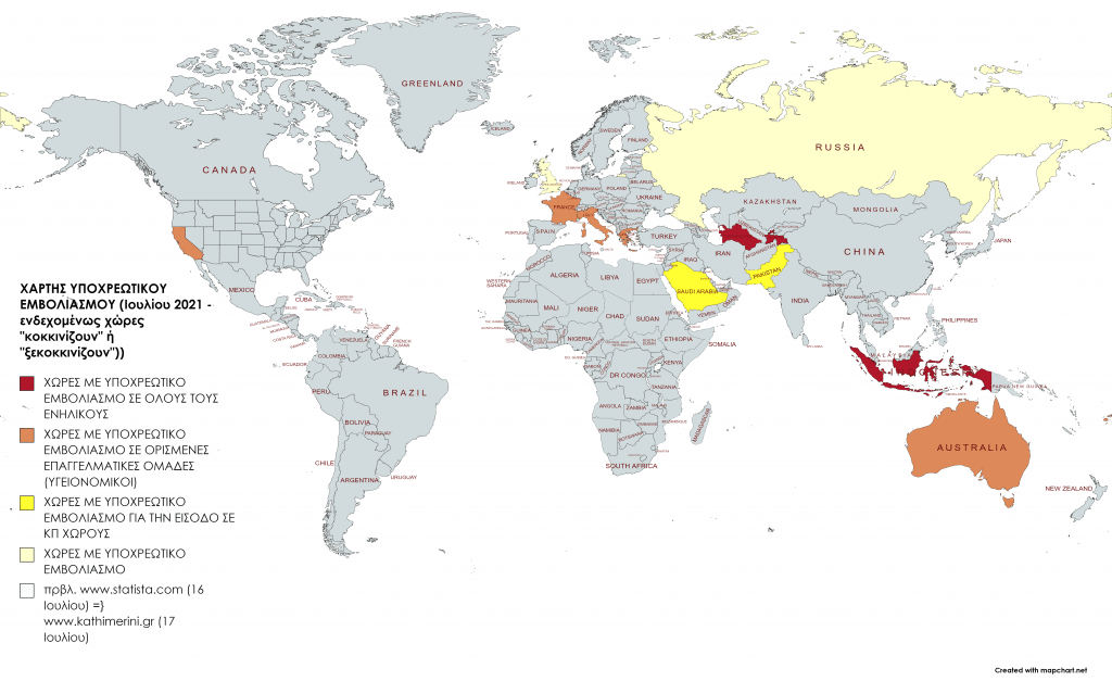 Χάριν Δημοσίου Διαλόγου, επισυνάπτουμε Παγκόσμιο Χάρτη Χωρών (Ιουλίου 2021) σταθμίζοντας με κόκκινο χρώμα το βαθμό «υποχρεωτικότητας» του Εμβολιασμού, καλώντας σε διόρθωση-