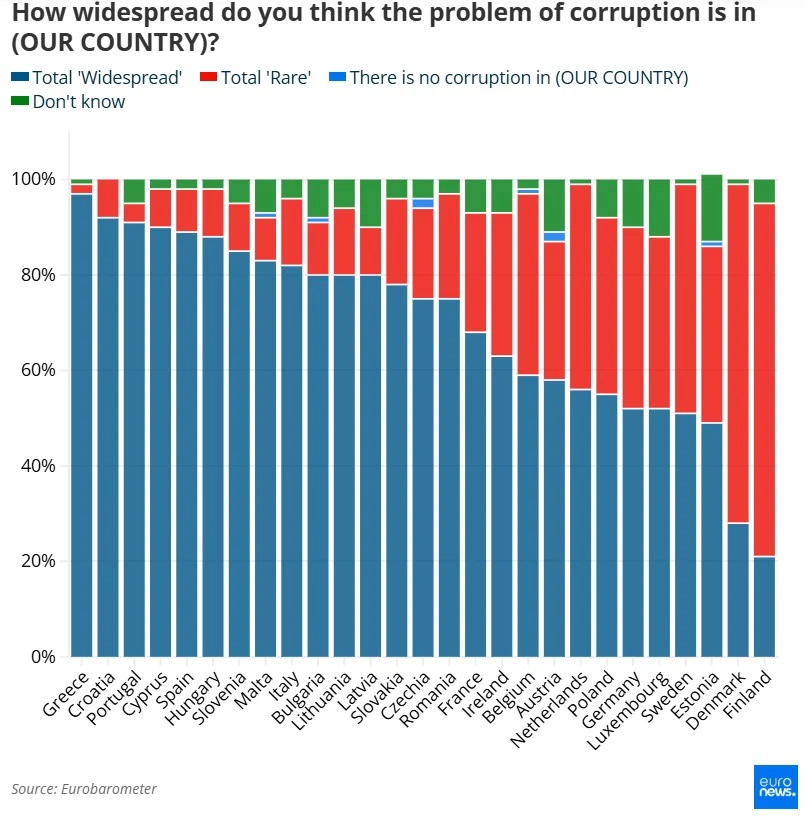 Αντίθετα, η Φινλανδία και η Δανία καταγράφουν τα χαμηλότερα ποσοστά αντίληψης διαφθοράς, με 21% και 28% αντίστοιχα.