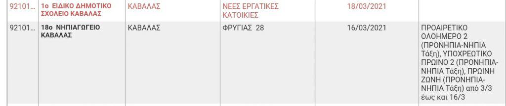 Με email που εστάλη σε γονείς μαθητών από τον διευθυντή του 2ου Δημοτικού Σχολείου Καβάλας το βράδυ της Τρίτης 9 Μαρτίου 2021, έγινε γνωστό πως εντοπίστηκαν κρούσματα κορωνοϊού σε 2 μαθητές (έναν στην 4η και έναν στην 1η τάξη). Εξαιτίας αυτού του εντοπισμού, τα παρακάτω τμήματα θα παραμείνουν κλειστά ως και τις 23 Μαρτίου: