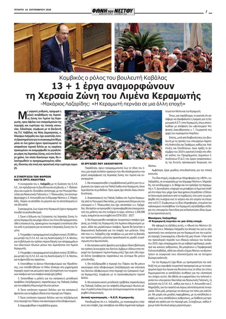 Στο πρόσφατο παρελθόν είχαμε γίνει γνώστες διαφόρων δηλώσεων και διακηρύξεων σχετικά με την ανάπτυξη του λιμανιού της Κεραμωτής. Το αποκορύφωμα, φυσικά, δεν θα μπορούσε να είναι παρά τα 13+1 έργα για την Κεραμωτή που διακήρυξε, με δηλώσεις του στην εφημερίδα “Φωνή του Νέστου” (στο φύλλο της 13ης Σεπτεμβρίου 2020) ο βουλευτής Καβάλας της ΝΔ Μακάριος Λαζαρίδης (ο οποίος τότε είχε τονίσει την αγαστή συνεργασία του με τη διοίκηση του ΟΛΚ -δηλ. τον πρόεδρο Γιώργο Φιλόσογλου και τη διευθύνουσα σύμβουλο Άννα Θυσιάδου-, το υπουργείο Ναυτιλίας και Νησιωτικής Πολιτικής, την αντιπεριφέρεια Καβάλας και το δήμο Νέστου)