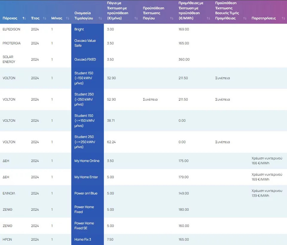 Ο πίνακας περιλαμβάνει την πάγια χρέωση και την τελική τιμή προμήθειας του σχετικού μήνα, κατόπιν υπολογισμού τυχόν εκπτώσεων.