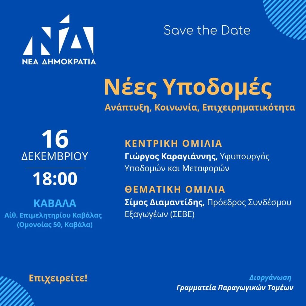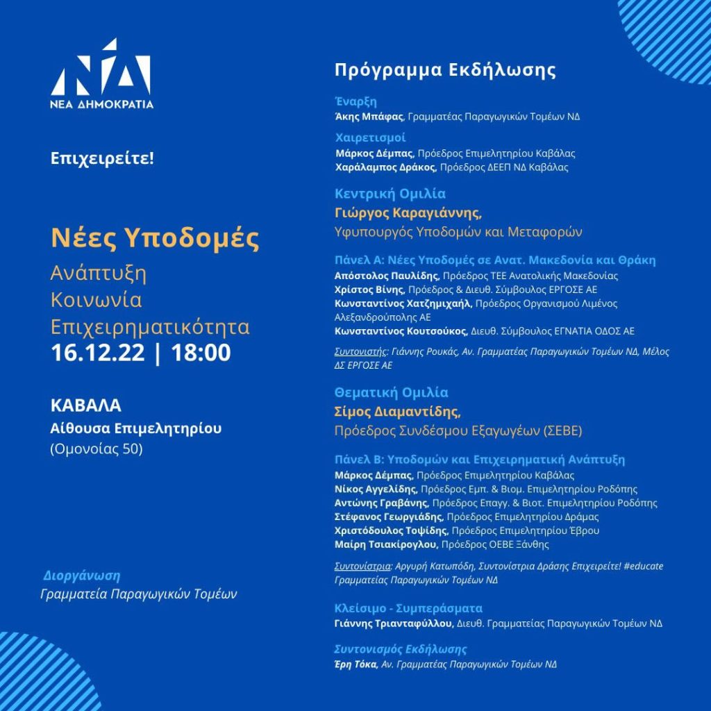 την Παρασκευή 16 Δεκεμβρίου 2022 & ώρα 18:00 μ.μ. στην Αίθουσα Εκδηλώσεων Επιμελητηρίου Καβάλας (Ομονοίας 50, Καβάλα)