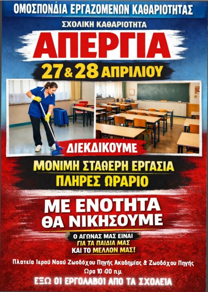Ενόψει της Πανελλαδικής Απεργίας της Ομοσπονδίας Εργαζομένων στη Σχολική Καθαριότητα σήμερα Δευτέρα 27 Απριλίου και αύριο Τρίτη 28 Απριλίου 2026, το ΔΣ της Ένωσης Συλλόγων Γονέων & Κηδεμόνων των Σχολείων του Δήμου Καβάλας τάσσεται στο πλευρό των Σχολικών Καθαριστριών του Δήμου μας και στηρίζει τις απεργιακές κινητοποιήσεις και τις διεκδικήσεις τους.