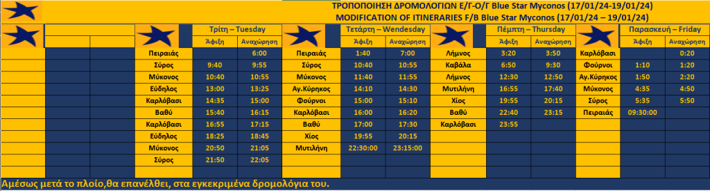 Ενημερώνουμε το επιβατικό κοινό ότι λόγω των δυσμενών καιρικών συνθηκών που επικρατούν στις περιοχές πλου και ειδικότερα στο Ικάριο Πέλαγος, το F/B BLUE STAR MYKONOS θα τροποποιήσει το πρόγραμμα δρομολογίων του από 17/01/24 έως 19/01/24.