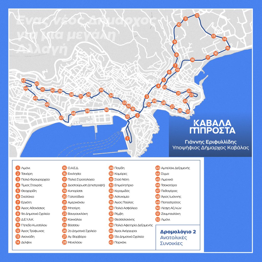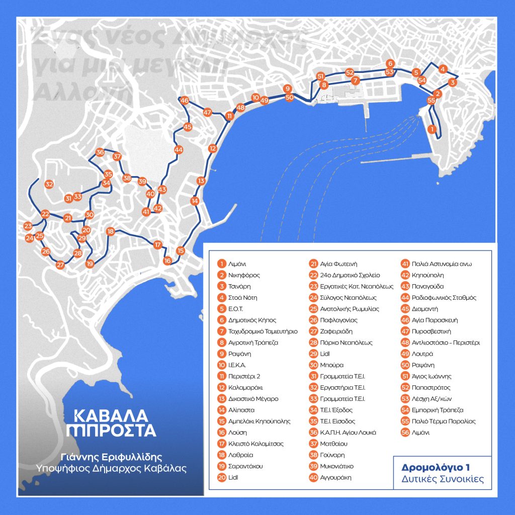 - Εισαγωγή 2 νέων γραμμών νυχτερινών λεωφορείων (ένα για τις ανατολικές και ένα για τις δυτικές συνοικίες της Καβάλας), τα οποία θα εξυπηρετούν τους δημότες ανά μία ώρα από τη λήξη και μέχρι την έναρξη των ημερήσιων δρομολογίων