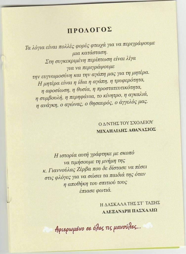 Διαδικαστικά, στην εφετινή εκδήλωση, πληροφορούμε ότι κυκλοφόρησε ένα ένθετο (βιβλιαράκι). Σε μία συλλογική συνεργασία, Δάσκαλοι, Μαθητές, αλλά και ο Σύλλογος Γονέων και Κηδεμόνων του σχολείου, προχώρησαν σε μία οργανωμένη και πολλή προσεγμένη έκδοση από πλευράς κειμένου και εικονογράφησης, με τον ΥΜΝΟ και την αυτοθυσία της ΜΑΝΑΣ.