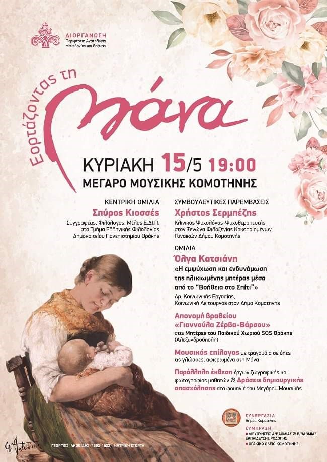 Η Περιφέρεια Μακεδονίας Θράκης, με τη σειρά της, αφού και αυτή αναγνωρίζει ότι η μάνα είναι η αρχή των πάντων στη ζωή μας, πραγματοποιεί εκδήλωση προς τιμήν της, στο «Μέγαρο Μουσικής Κομοτηνής» στις 15/5/2022, στις 19:00.