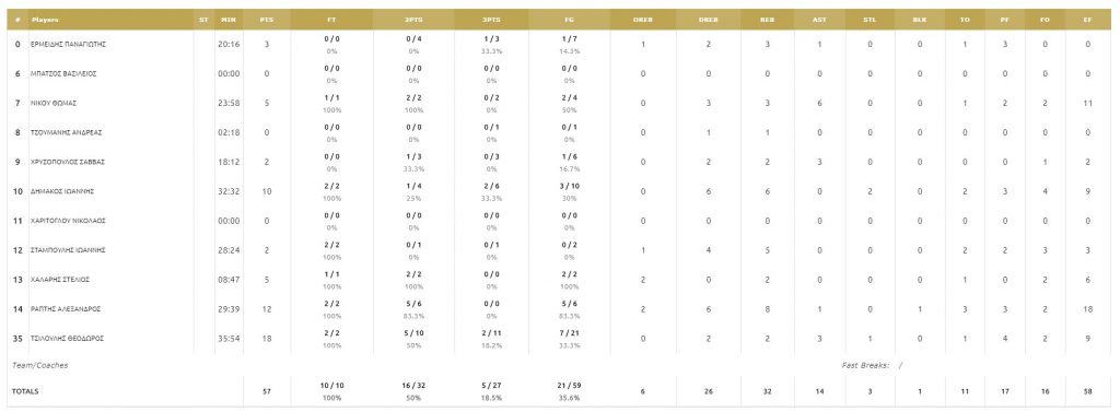 Ψυχικό (Ρεμεντέλας): Δελίδης 19 (5), Παπανικολάου 5 (1), Κιούσης 2, Μιλεντίγεβιτς 10 (1), Τσουργιάννης 4, Καραχάλιος 6, Μαστόρος 5, Κυρίτσης 12 (2), Αναγνωστόπουλος, Ιορδάνου 8.