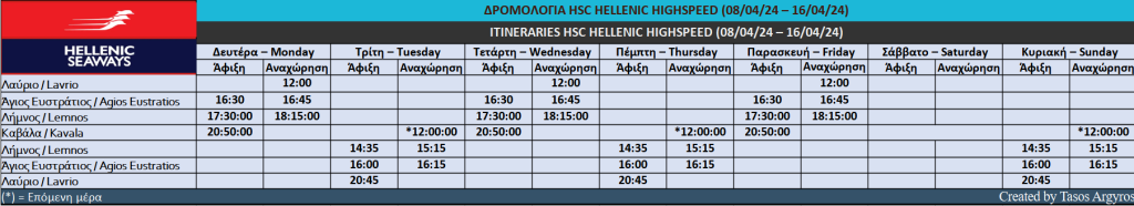Το ταχύπλοο τύπου Monohull, πρόκειται να ξεκινήσει τα εμπορικά του δρομολόγια, τη Δευτέρα 08/04 με αναχώρηση στις 12:00 από το λιμάνι του Λαυρίου, προς Αγ Ευστράτιο – Λήμνο – Καβάλα και επιστροφή.