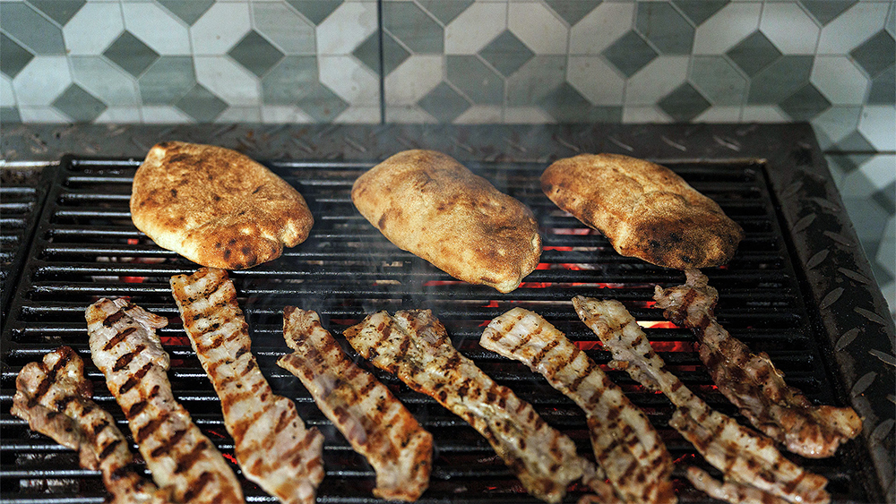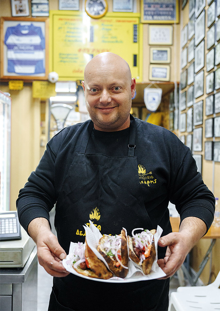 Είναι νόμος στην Καβάλα αυτό», λέει γελώντας ο γιος του, Παναγιώτης, που αναλαμβάνει την απογευματινή βάρδια. Εκτός από τη γέμιση, άλλο ένα κοινό χαρακτηριστικό που έχουν τα καβαλιώτικα σουβλάκια είναι η πίτα, η οποία καμία σχέση δεν έχει με την κλασική λαδόπιτα.