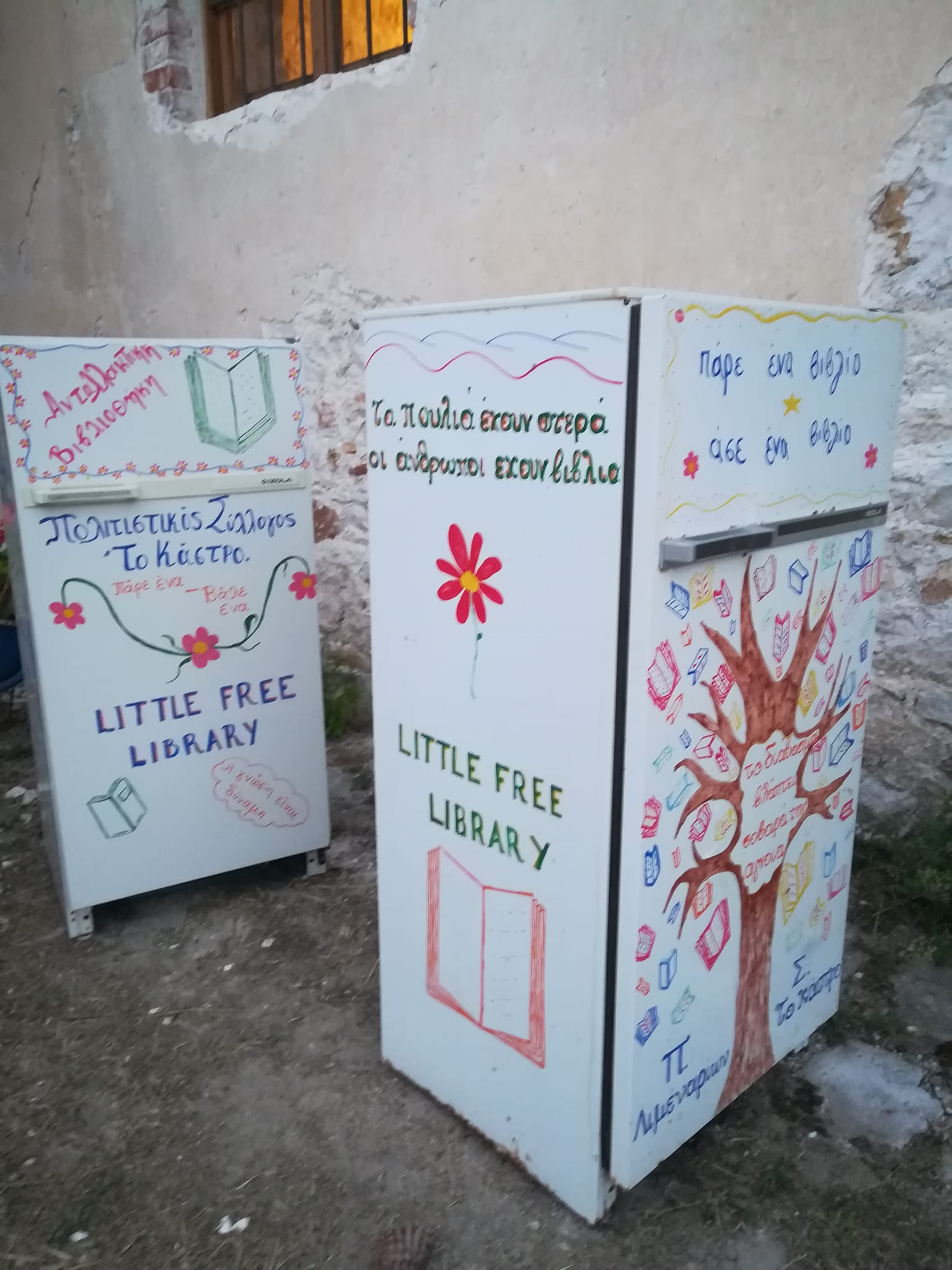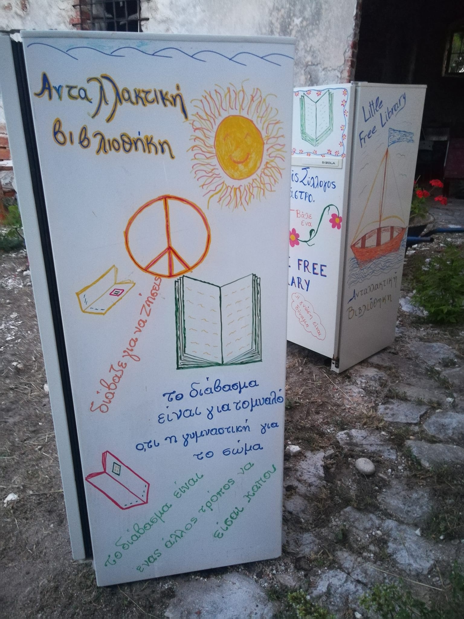 Μετατρέψαμε τα παροπλισμένα ψυγεία σε βιβλιοθήκες δρόμου, απο όπου μπορείς με την διαδικασία του ” πάρε ένα – άσε ένα ” να δανειστείς , να ανταλλάξεις και να δωρίσεις βιβλια .