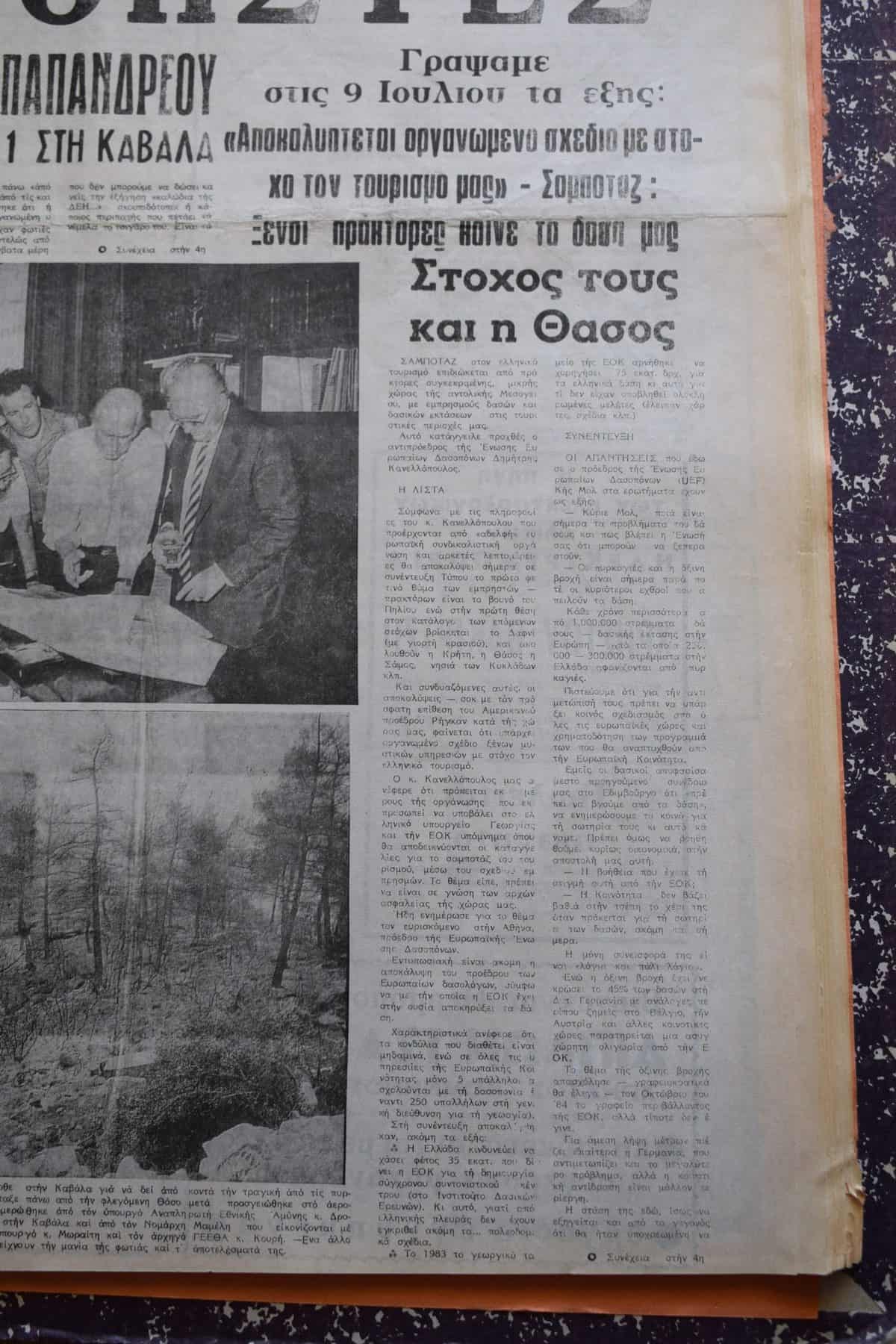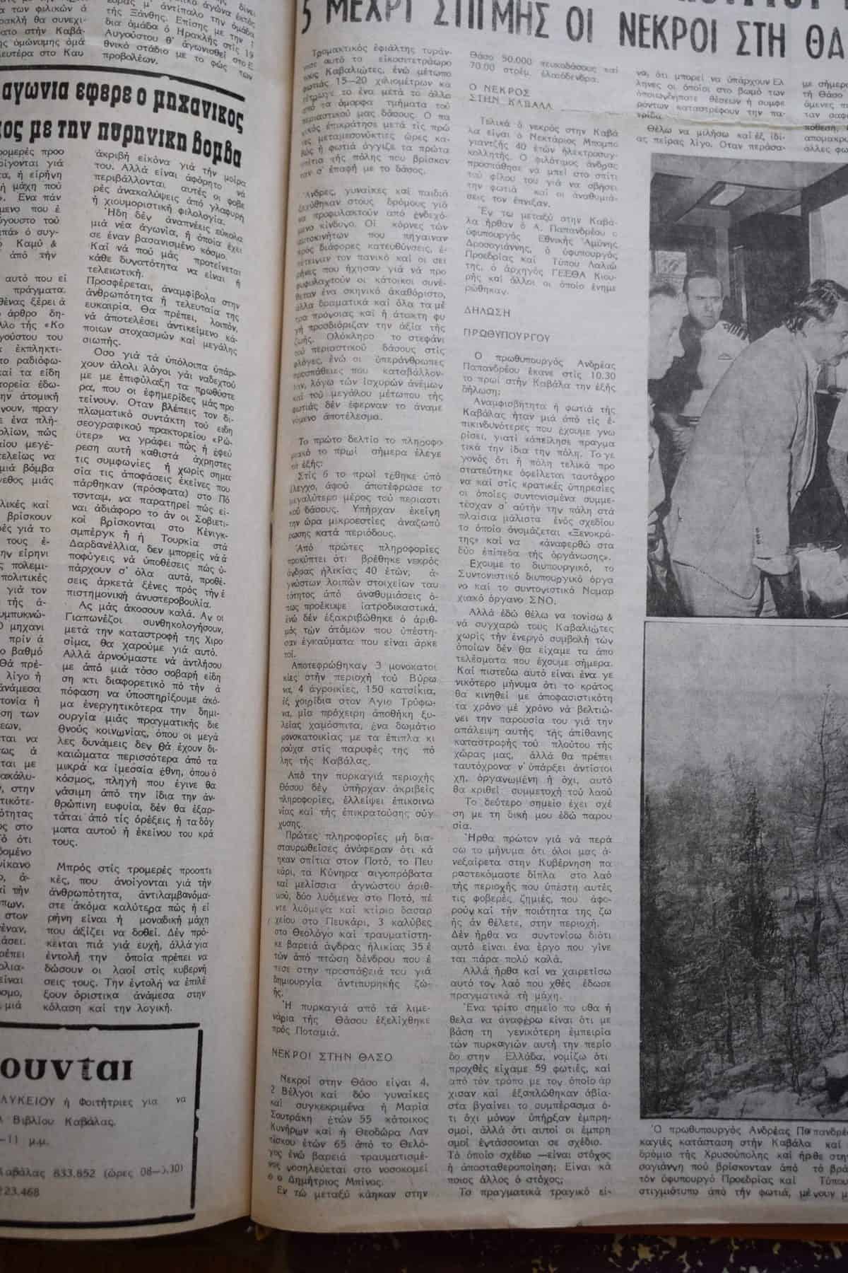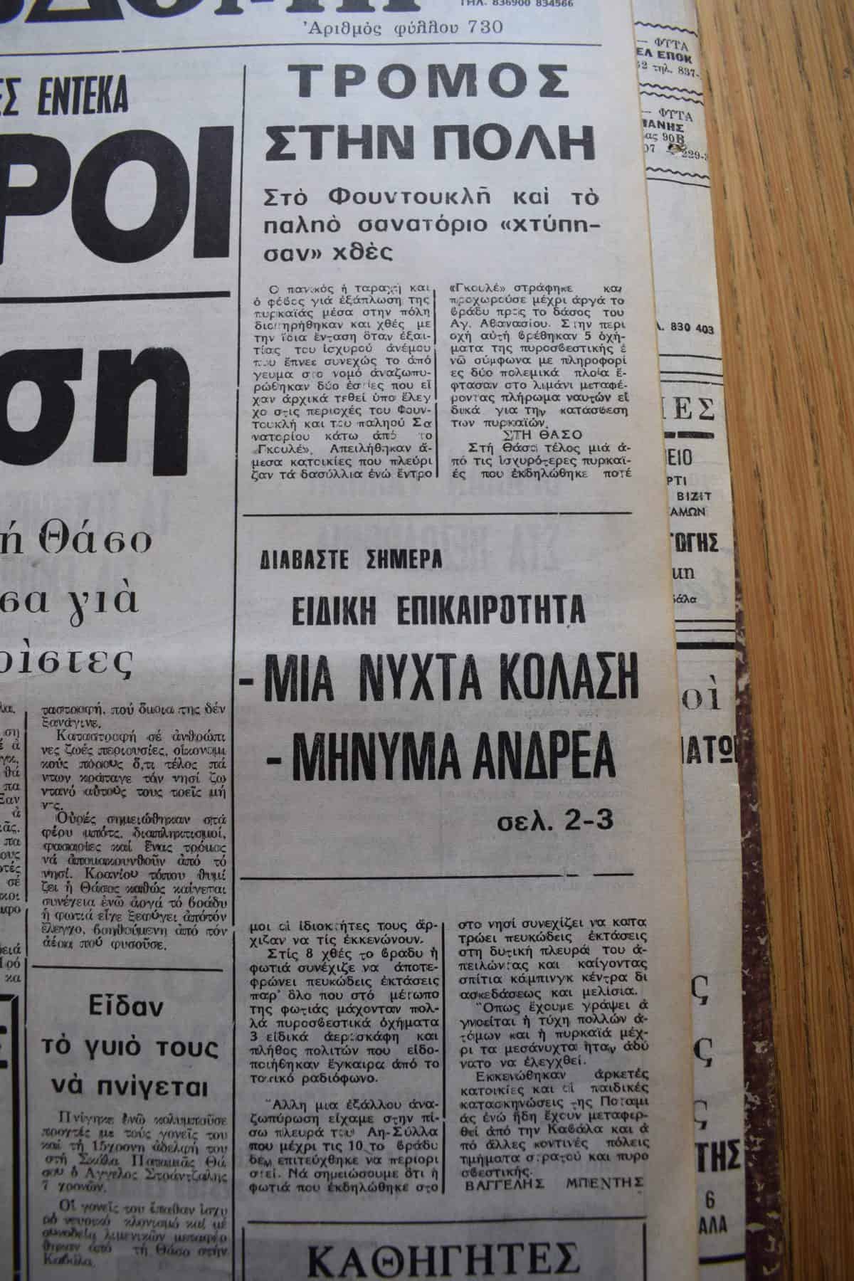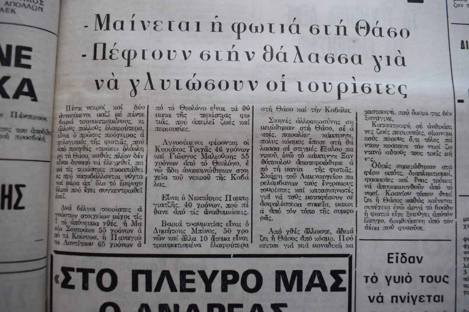 Το εκτενέστερο ρεπορτάζ για τη φωτιά στη Θάσο δημοσιεύτηκε στον ΤΑΧΥΔΡΟΜΟ (σημαντικές αναφορές υπήρχαν, βέβαια, στην ΠΡΩΙΝΗ και στην ΕΒΔΟΜΗ). Σύμφωνα με το δημοσίευμα,