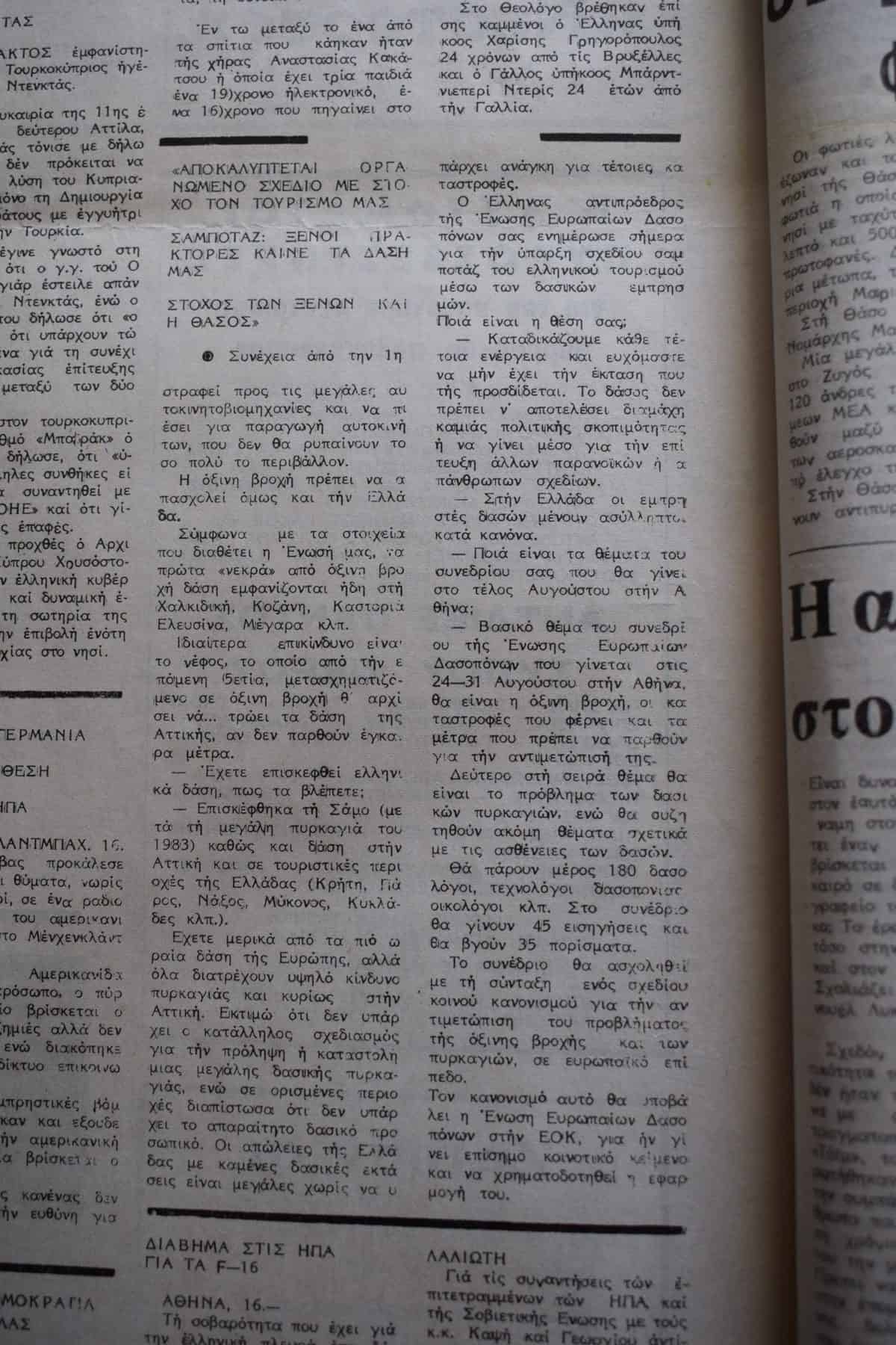 Ενδιαφέρον, όμως, παρουσίασε μια αναφορά της εφημερίδας ΚΑΒΑΛΑ σε ένα άρθρο που είχε δημοσιευτεί στις 9 Ιουλίου 1985 (40 μέρες, δηλαδή, πριν τη φωτιά), το οποίο μιλούσε για “οργανωμένο σχέδιο με στόχο τον τουρισμό” και για “ξένους πράκτορες που καίνε τα δάση μας”. Το άρθρο εκείνο στηριζόταν σε καταγγελίες του αντιπροέδρου της Ένωσης Ευρωπαίων Δασοπόνων Δημήτρη Κανελλόπουλου, ο οποίος έκανε λόγο για “στόχευση” του Πηλίου, του Δαφνιού, της Κρήτης, της Θάσου, της Σάμου και νησιών των Κυκλάδων.