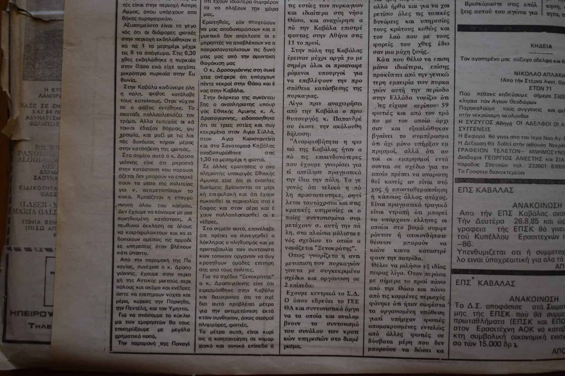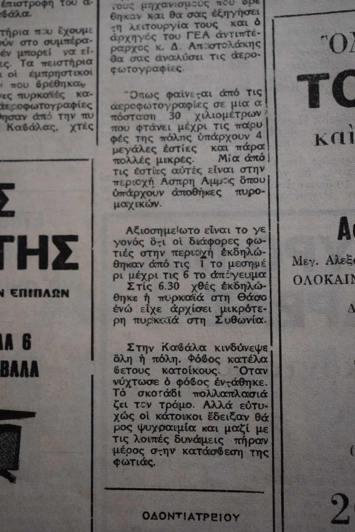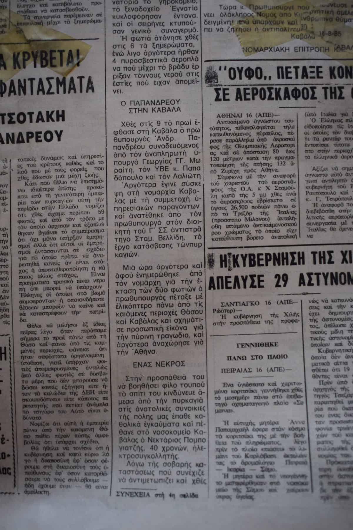 Την ημέρα εκείνη ξέσπασε, όπως αναφέραμε, η μεγάλη πυρκαγιά της Καβάλας. Οι εφημερίδες είχαν ήδη εκδοθεί λίγες ώρες νωρίτερα, ενώ εκείνα τα χρόνια δεν υπήρχε το Internet και οι ιδιωτικοί τηλεοπτικοί και ραδιοφωνικοί σταθμοί (μόνο η ΕΡΤ και η ΕΡΑ).