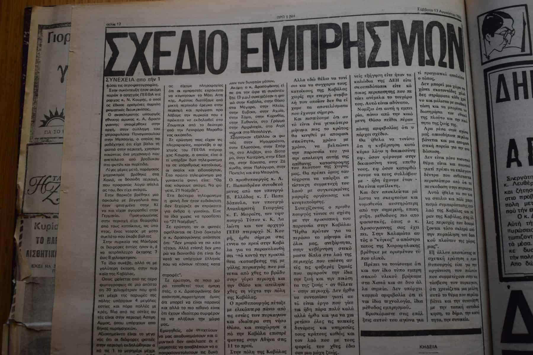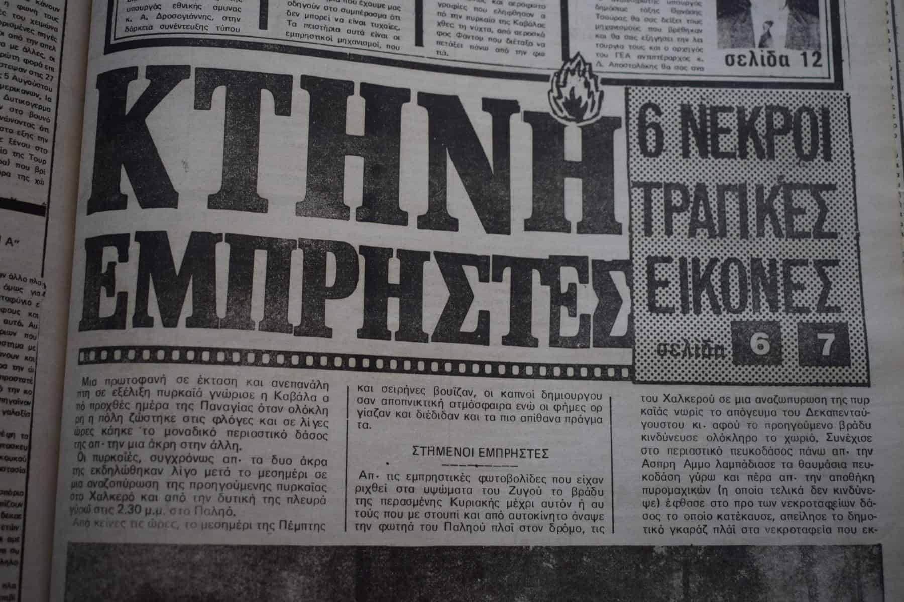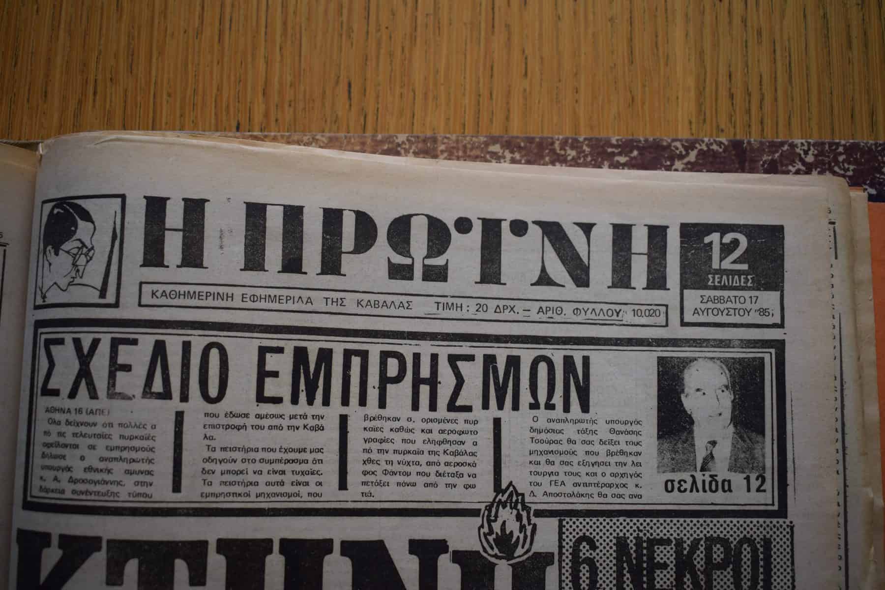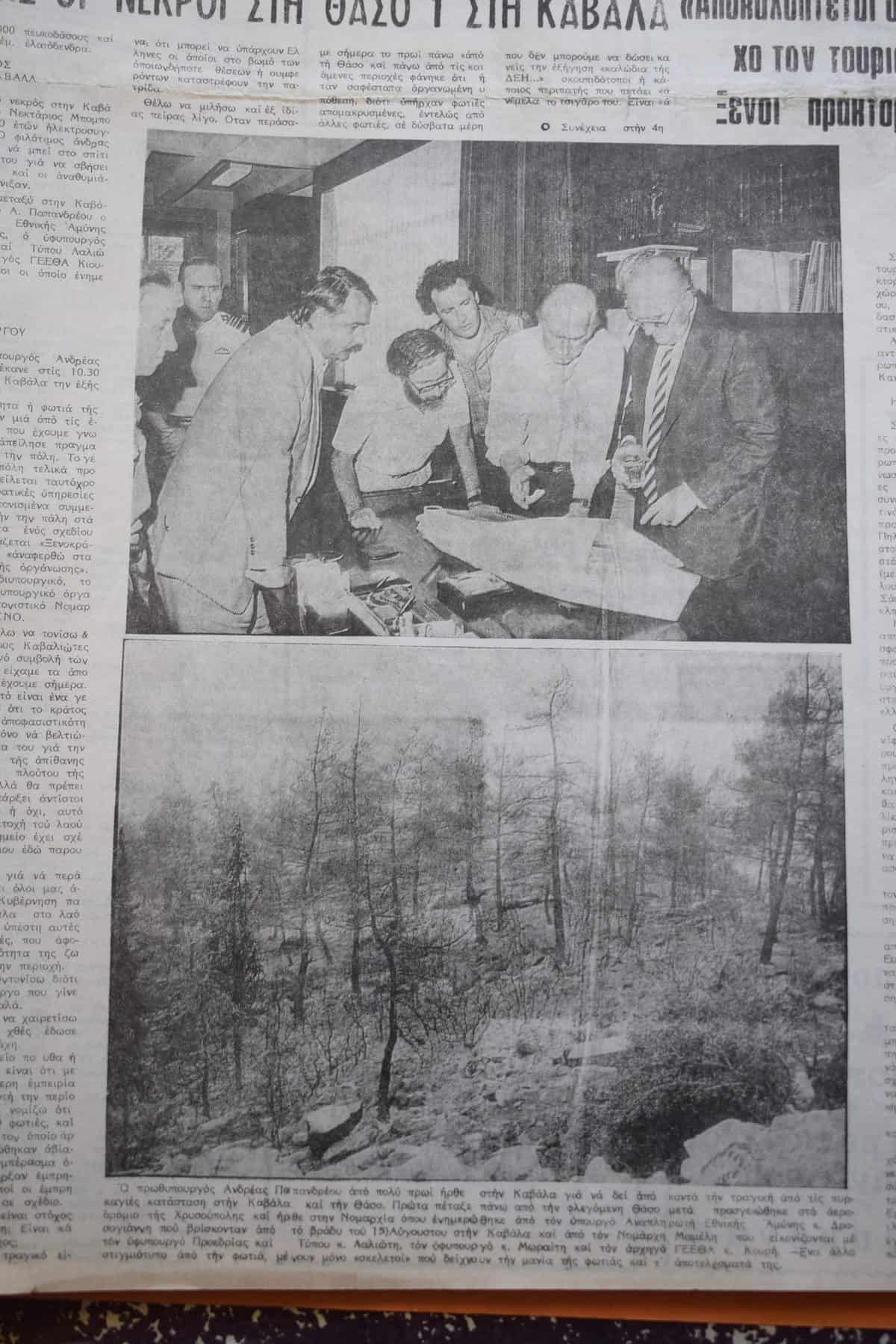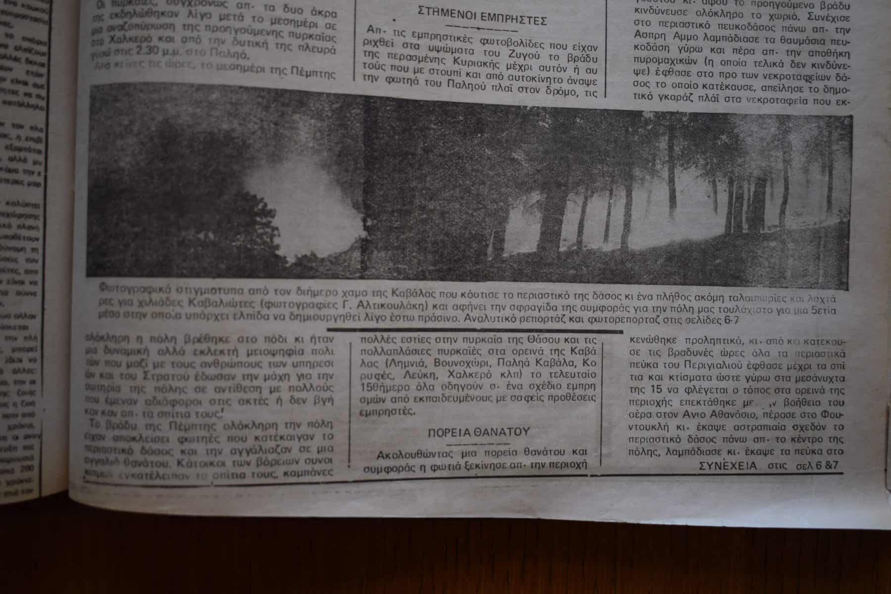 Ας δούμε, όμως, πώς κάλυψαν οι εφημερίδες της εποχής την φονική αυτή πυρκαγιά -μέσα από το αρχείο εφημερίδων της Δημοτικής Βιβλιοθήκης Καβάλας. Το αφιέρωμά μας θα είναι εκτενές και θα παρατεθεί σε περισσότερα του ενός άρθρα -καθένα από τα οποία θα ασχολείται με δημοσιεύματα που εκδόθηκαν σε διαφορετικές χρονικές στιγμές, από τη 15η Αυγούστου ως και τα μέσα Σεπτεμβρίου (οπότε και απομακρύνθηκε ο τότε νομάρχης Κώστας Μαμέλης -κατά πολλούς, ένας από τους υπεύθυνους για το ότι η φωτιά επεκτάθηκε τόσο πολύ και τόσο γρήγορα).