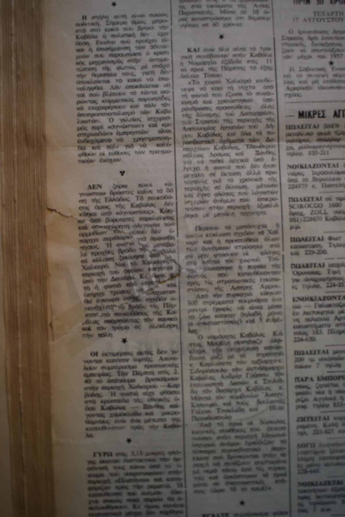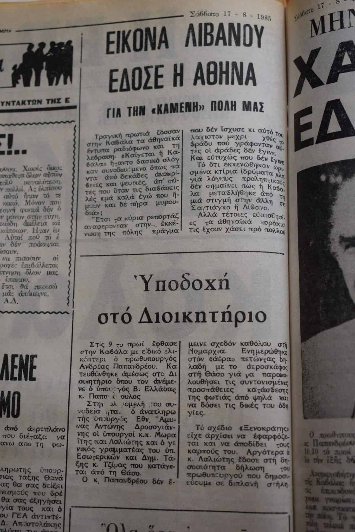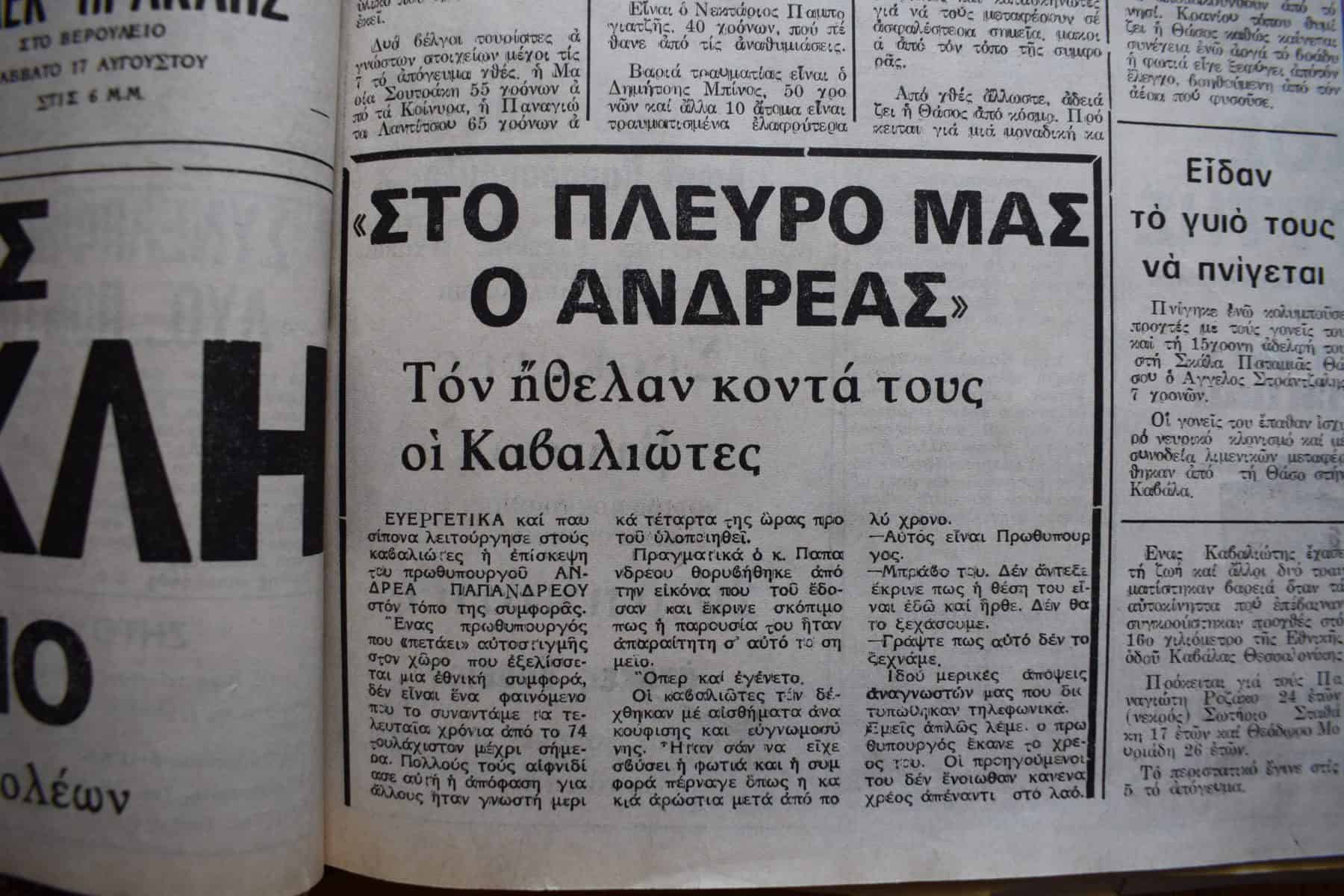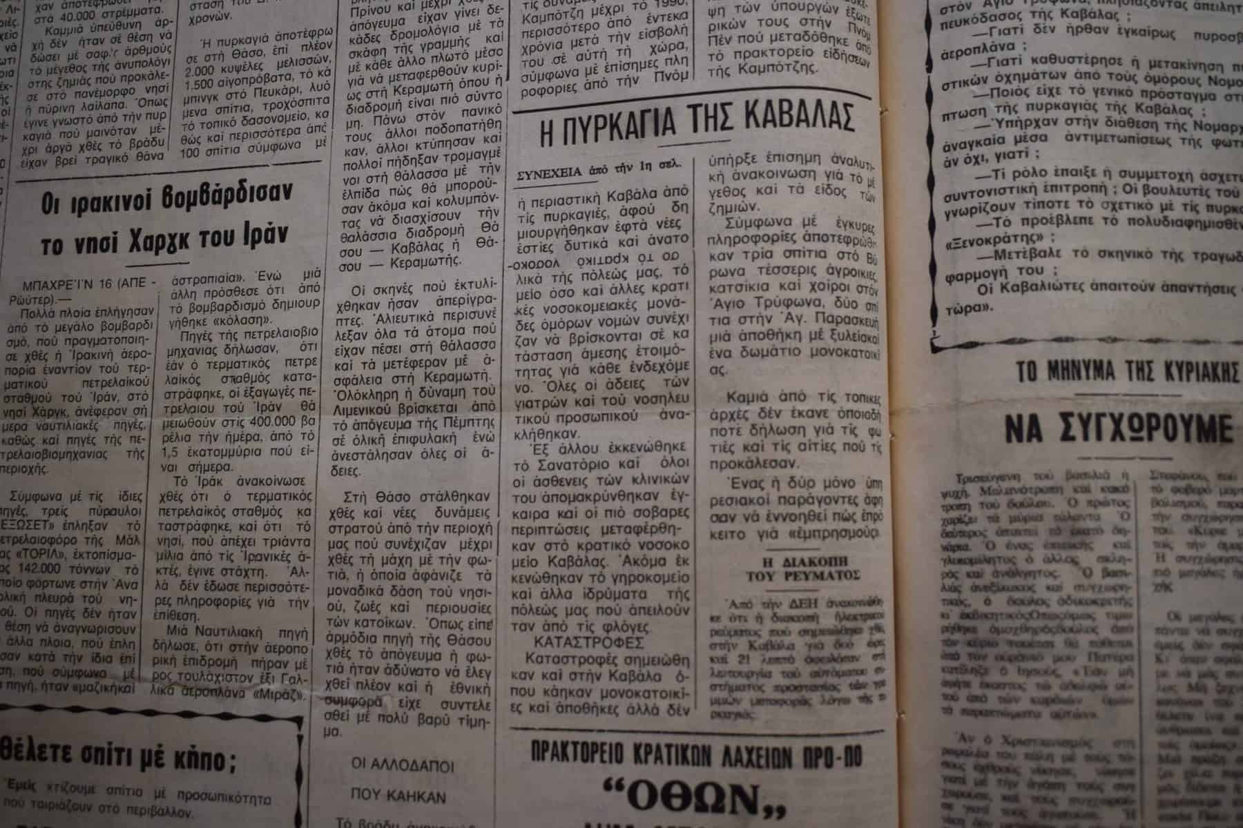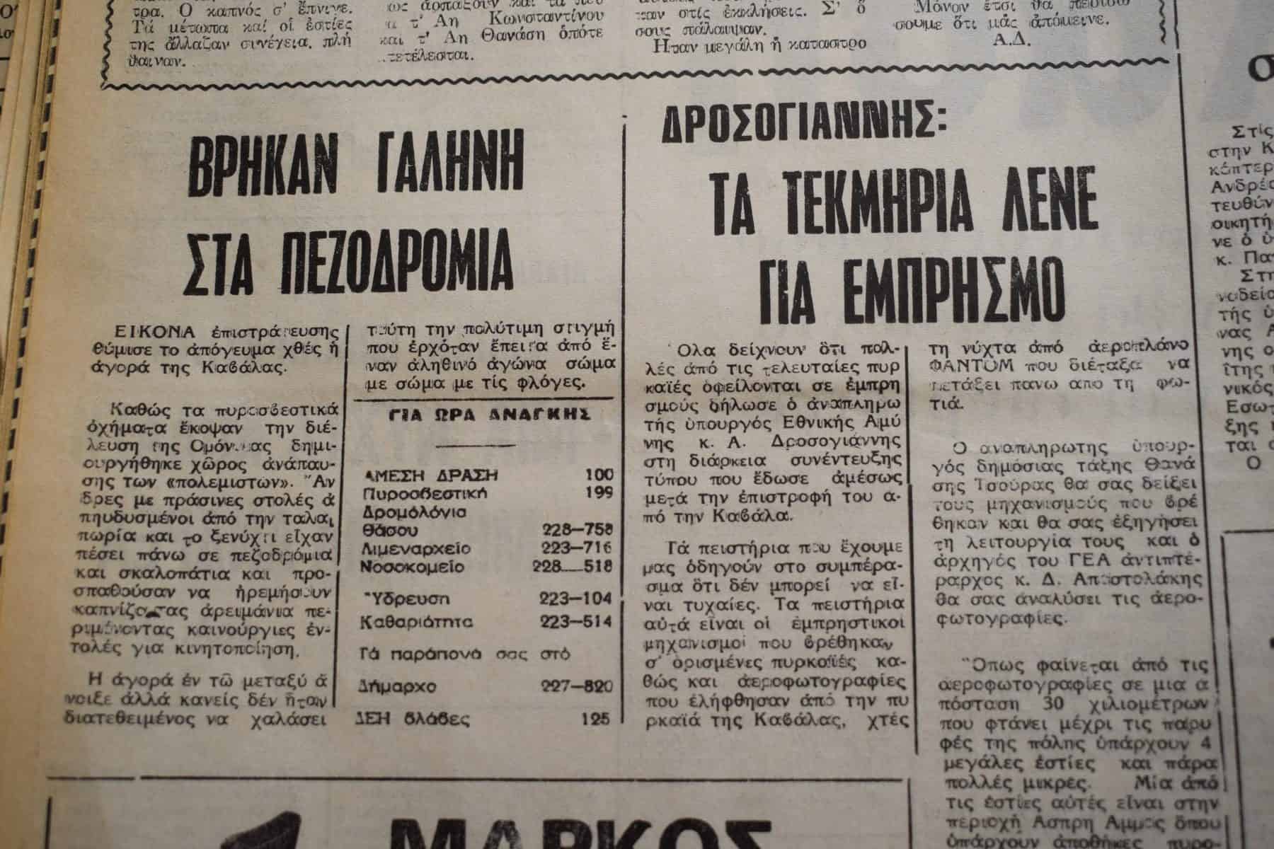 Ας δούμε, όμως, πώς κάλυψαν οι εφημερίδες της εποχής την φονική αυτή πυρκαγιά -μέσα από το αρχείο εφημερίδων της Δημοτικής Βιβλιοθήκης Καβάλας. Το αφιέρωμά μας θα είναι εκτενές και θα παρατεθεί σε περισσότερα του ενός άρθρα -καθένα από τα οποία θα ασχολείται με δημοσιεύματα που εκδόθηκαν σε διαφορετικές χρονικές στιγμές, από τη 15η Αυγούστου ως και τα μέσα Σεπτεμβρίου (οπότε και απομακρύνθηκε ο τότε νομάρχης Κώστας Μαμέλης -κατά πολλούς, ένας από τους υπεύθυνους για το ότι η φωτιά επεκτάθηκε τόσο πολύ και τόσο γρήγορα).