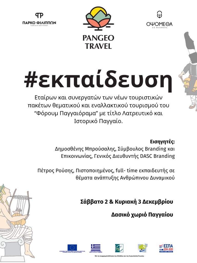 Η Επιστημονική ομάδα “Οψόμεθα εις Φιλίππους” σε συνεργασία με το Δασικό Χωριό Παγγαίου στο πλαίσιο της δημιουργίας των 2 νέων τουριστικών πακέτων με κεντρικό θέμα το Λατρευτικό και Ιστορικό Παγγαίο διοργανώνει για τους εταίρους και τους συνεργάτες του “Φόρουμ Παγγαιόραμα”, διαδραστική εκπαίδευση με τους Δημοσθένη Μπρούσαλη και Πέτρο Ρούση. Η εκπαίδευση θα πραγματοποιηθεί το διάστημα 2-3 Δεκεμβρίου 2023 στο Δασικό χωριό Παγγαίου.