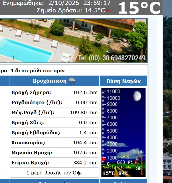 192.6 λίτρα βροχής ανά τετραγωνικό μέτρο (102.6 mm) κατέγραψε την Πέμπτη 2 Οκτωβρίου 2025 ο μετεωρολογικός σταθμός του δικτύου του meteokav.gr στον Λιμένα Θάσου (https://www.meteothassos.gr/).
