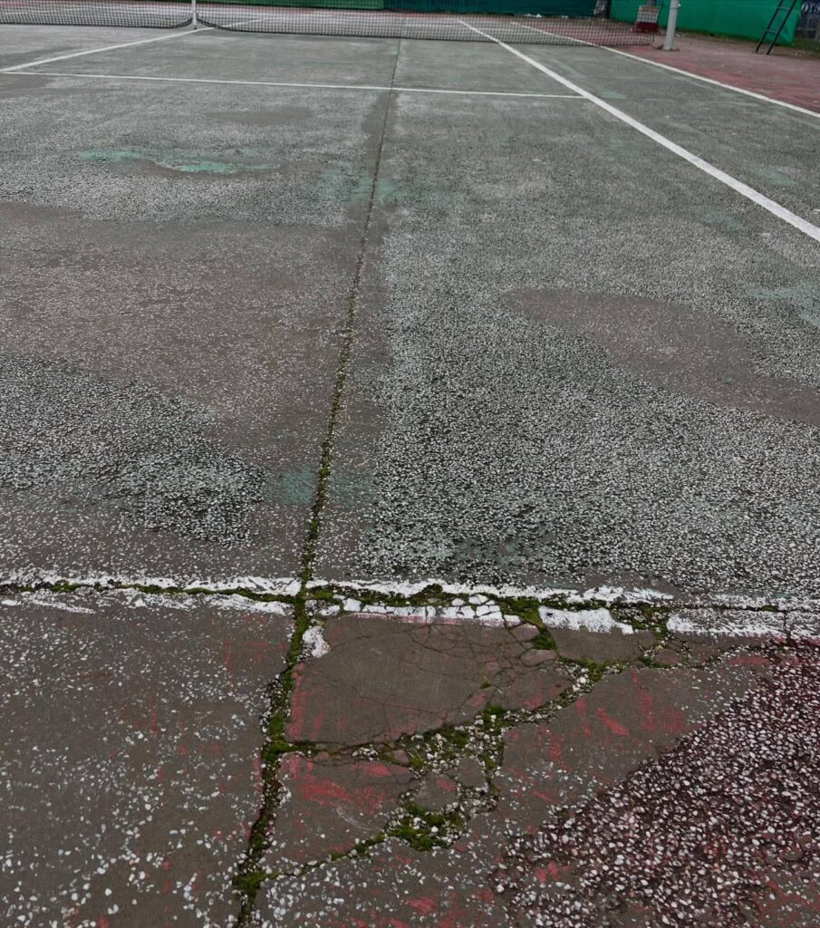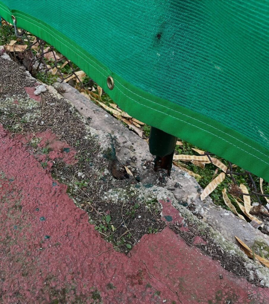 Σπασμένα προστατευτικά σύρματα, φθαρμένες επιφάνειες, σπασμένα φιλέ συνθέτουν ένα σκηνικό που κρίνεται όχι μόνο ακατάλληλο για την προπόνηση των εκατοντάδων αθλητών αλλά και επικίνδυνο για τη σωματική τους ακεραιότητα.