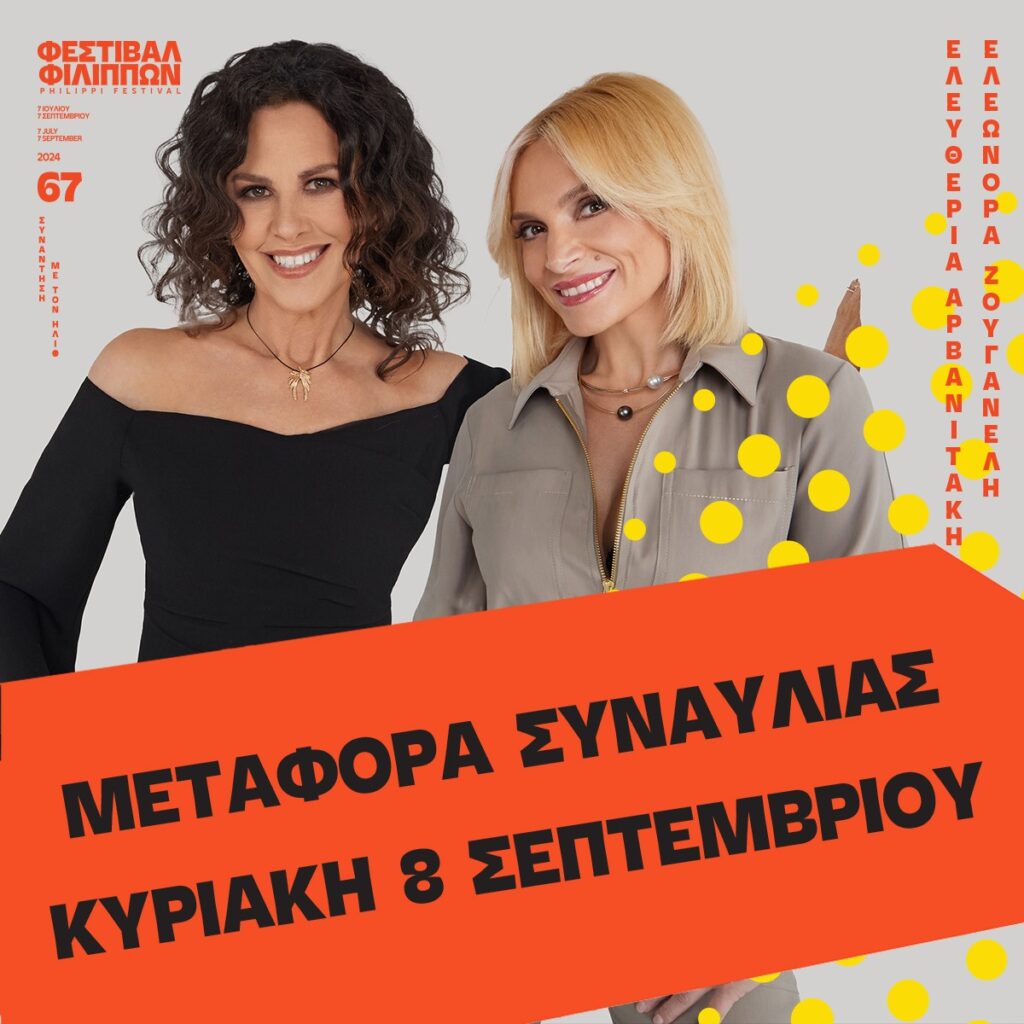 H συναυλία ΞΑΝΑ ΜΑΖΙ της Ελ. Αρβανιτάκη- Ελ. Ζουγανέλη που δεν μπόρεσε να πραγματοποιηθεί λόγω βροχής στις 30.8 ΜΕΤΑΦΕΡΕΤΑΙ για την ΚΥΡΙΑΚΗ 8.9 στις 21:00 στο Αρχαίο Θέατρο Φιλίππων. Τα εισιτήρια που είχαν εκδοθεί ισχύουν κανονικά και θα μεταφερθούν αυτόματα στη νέα ημερομηνία. Αν κάποιος/α δεν επιθυμεί να την παρακολουθήσει, καλείται να επιστρέψει το φυσικό εισιτήριο στα σημεία φυσικής προπώλησης και να του επιστραφούν τα χρήματά του έως και την Τετάρτη 4.9.