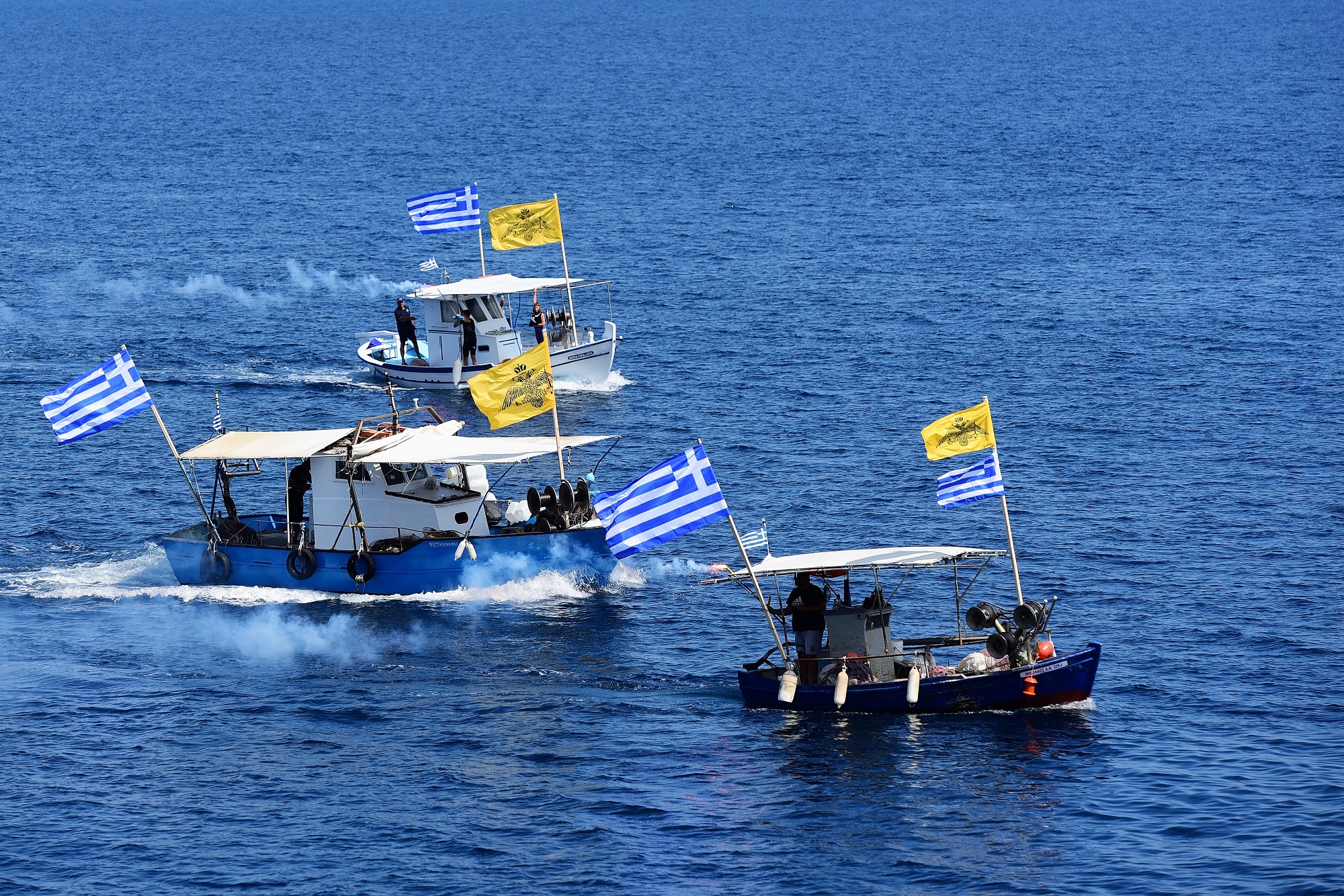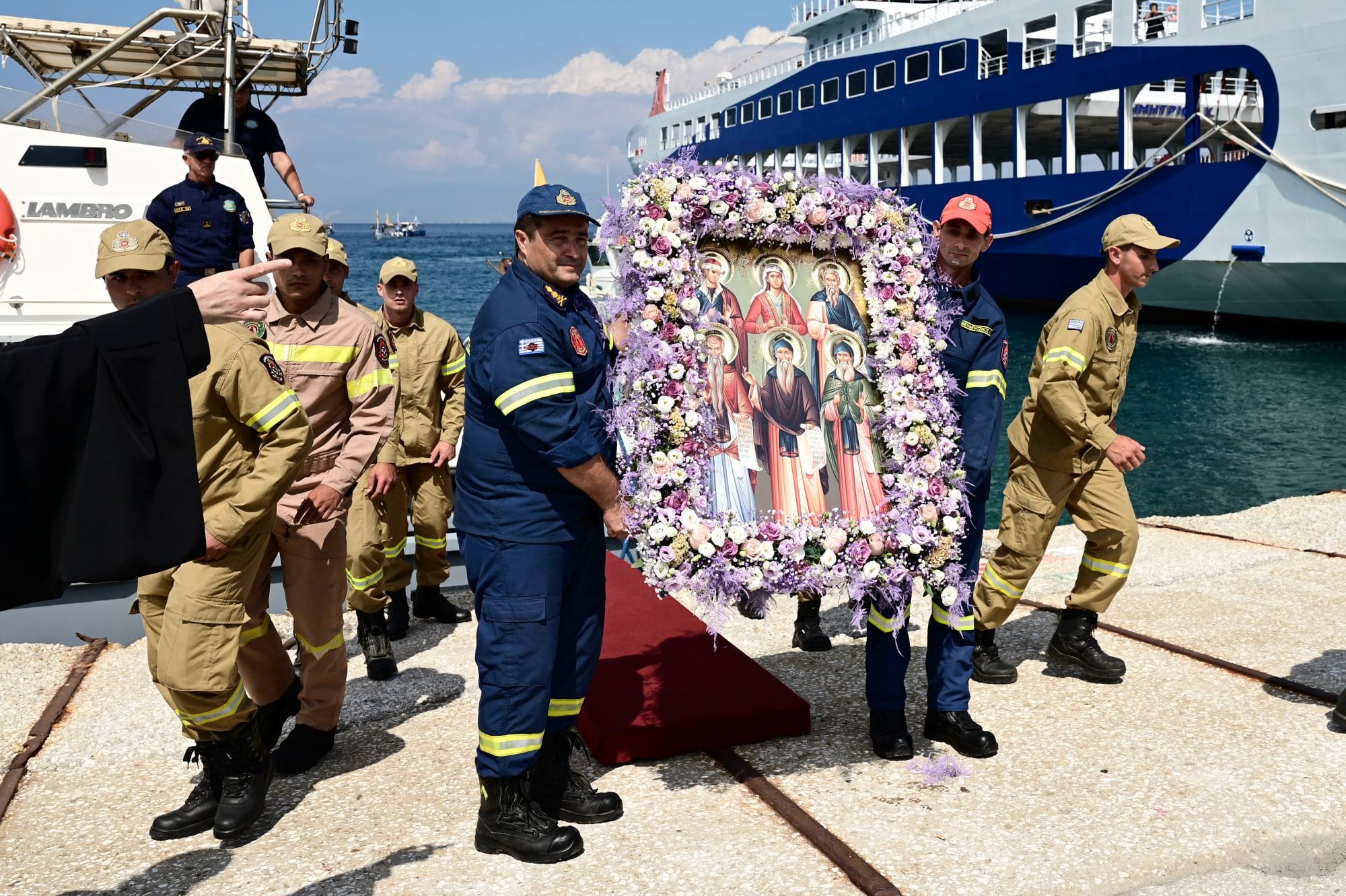 Στη συνέχεια, μετά από το αεροδρόμιο μετέβησαν οι πάντες στο λιμάνι της Κεραμωτής, όπου και επιβιβάσθηκαν στο Πλοίο «Δημήτριος», με προορισμό την Θάσο. Το πλοίο της γραμμής συνόδευσε πλοίο του Πολεμικού Ναυτικού, το οποίο είχε σταθμεύσει στο λιμάνι της Κεραμωτής λίγο νωρίτερα από την άφιξη των Υψηλών επισκεπτών της περιοχής.